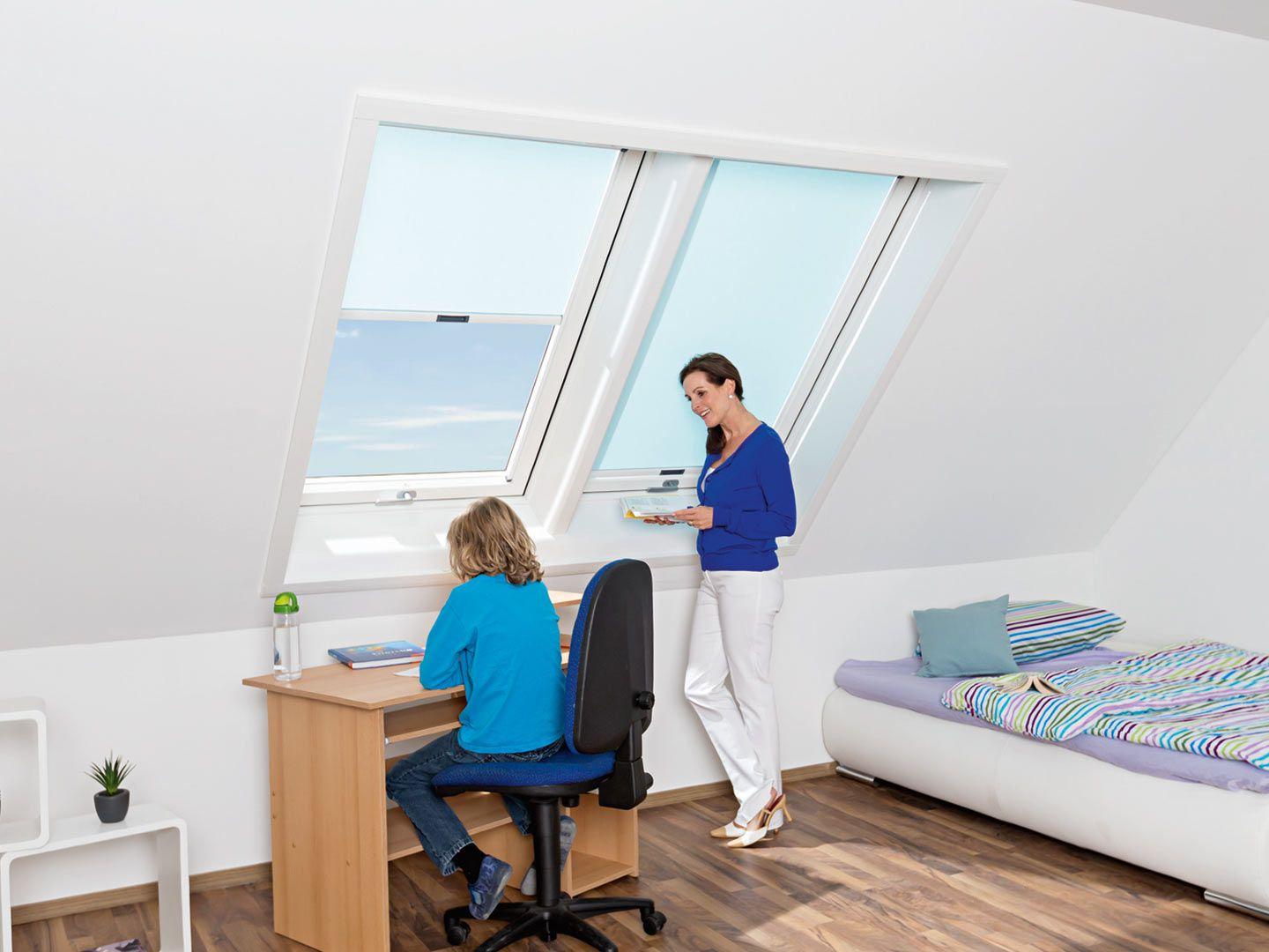 Niet elke kinderkamer in het dak biedt voldoende ruimte voor meerdere dakramen naast elkaar. Maar een kamer zonder licht zou hier de verkeerde beslissing zijn. Een alternatief is een tandeminstallatie. Kies bijvoorbeeld voor het Roto Designo R6/R8-dakraam op maat en u kunt raamlengtes tot 1,80 meter bereiken. Zo kunt u optimaal gebruik maken van de hoogte van het dak en het daglicht - met inachtneming van alle veiligheidsaspecten!